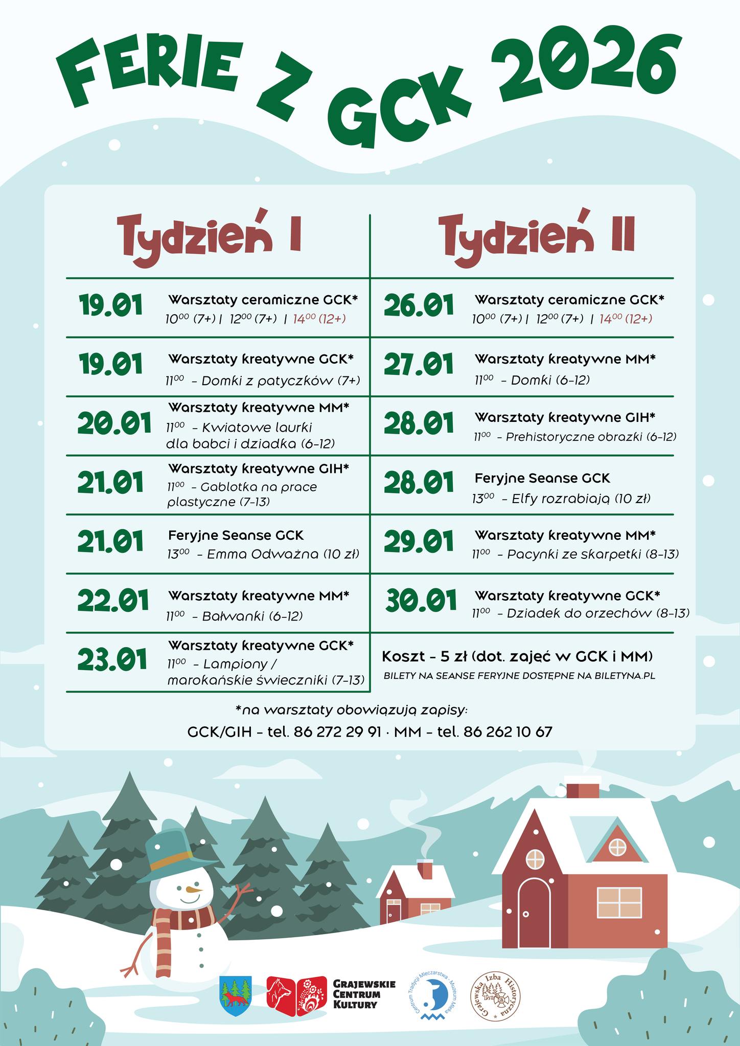 Ferie zimowe z Grajewskim Centrum Kultury odbywały się w dniach 19–30 stycznia 2026 roku. Program obejmował warsztaty realizowane w GCK oraz jego oddziałach: Centrum Tradycji Mleczarstwa – Muzeum Mleka i Grajewskiej Izbie Historycznej.