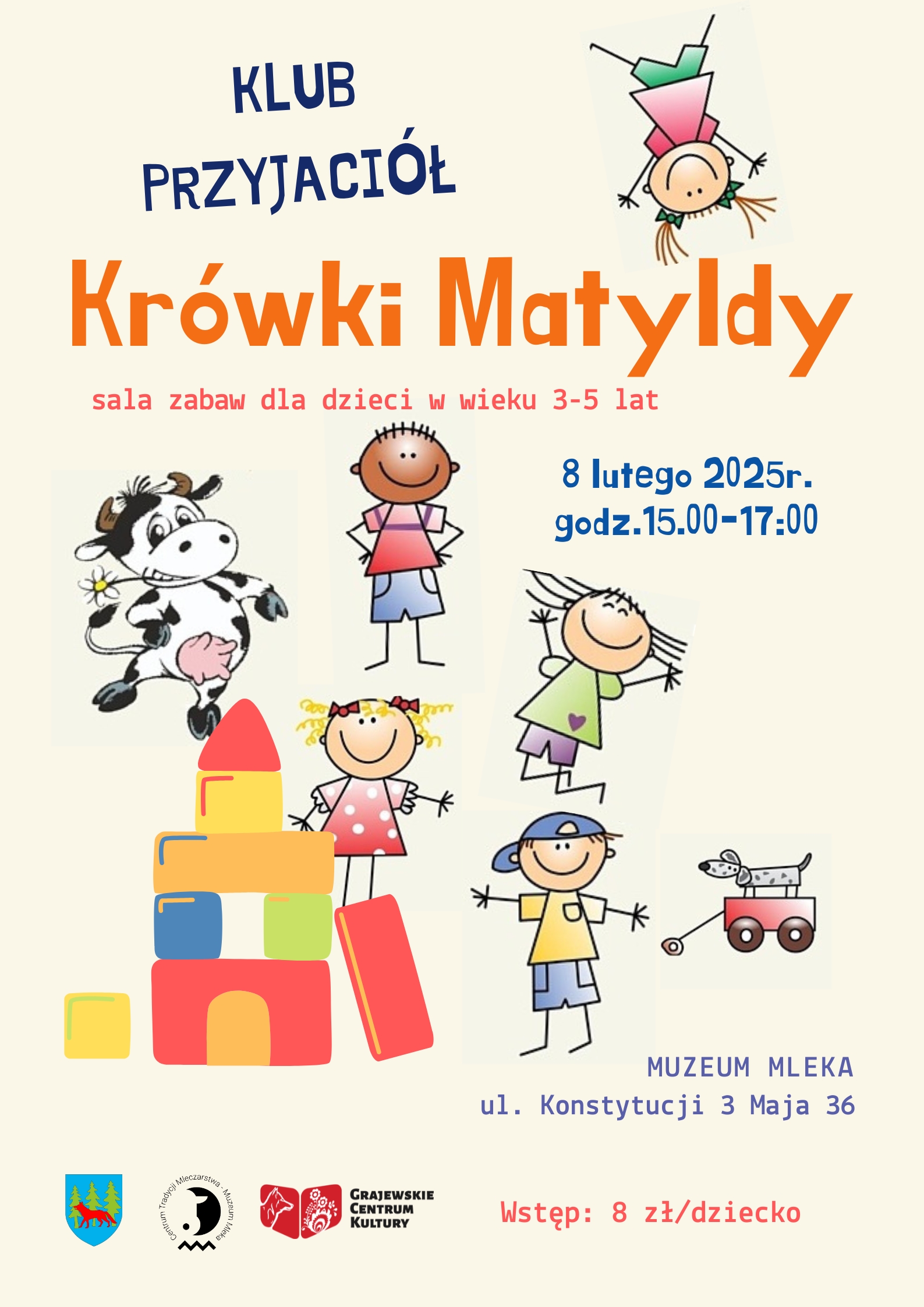 do sali zabaw Muzeum Mleka w Grajewie. Klub Przyjaciół Krówki Matyldy jest miejscem, w którym dzieci mają szansę na zabawę i integrację z rówieśnikami, rodzice zaś na wymianę doświadczeń w miłej i przyjaznej atmosferze.
