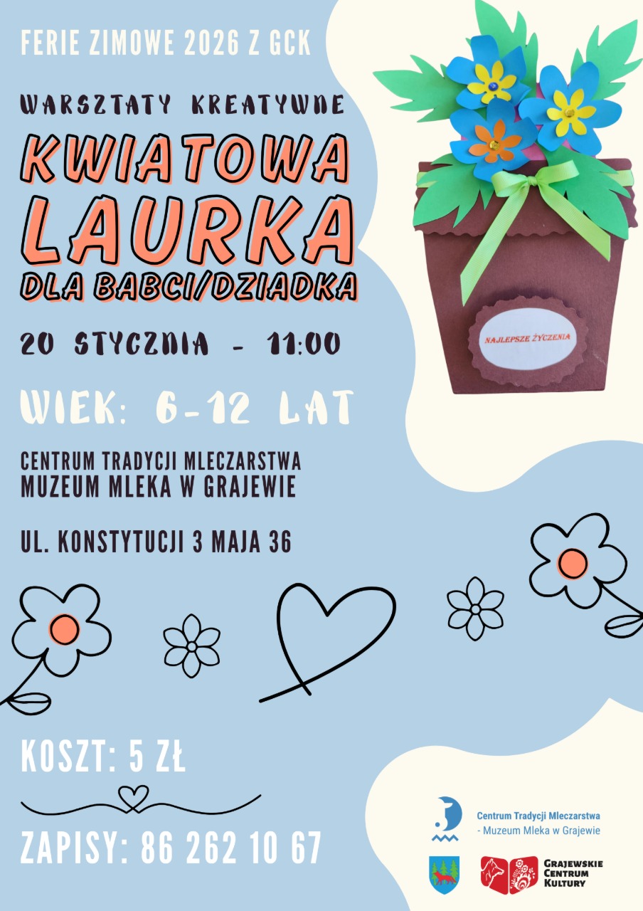 Centrum Tradycji Mleczarstwa - Muzeum Mleka w Grajewie, Oddział Grajewskiego Centrum Kultury serdecznie zaprasza dzieci w wieku 6 - 12 lat na warsztat " Kwiatowe laurki na Dzień Babci i Dziadka "